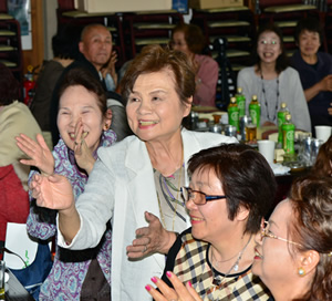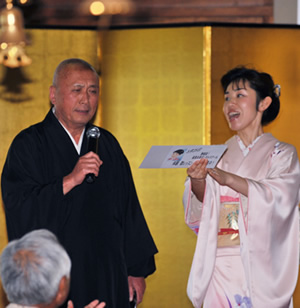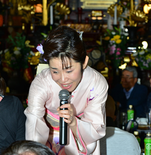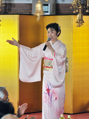 | 美空ひばりメドレーを歌いながら客席に降りてみなさんと握手のひととき | なんと本光寺ご住職もショーに参加。 マル秘のかくし芸に会場大爆笑。 |